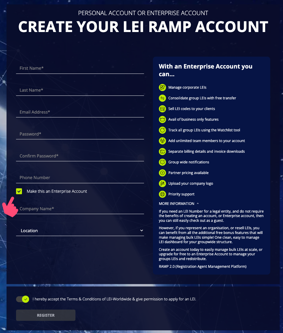 An Enterprise RAMP account is for organisations to manage a portfolio of LEIs. Create your company account e.g 'ACME Ltd' and upload your logo. Your can team access enterprise only features such as inviting team members to the account and sharing billing details across the group.